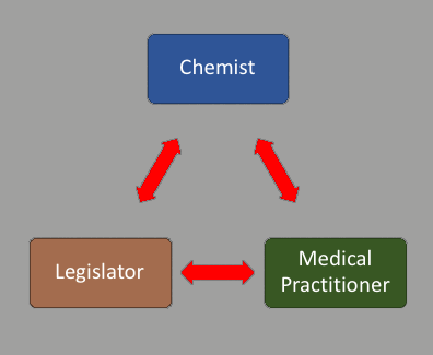 To describe the cycle, I will start with the invention of a new compound. This is done by chemists or people who employ them. This faction in the life cycle of an NPS (New Psychoactive Substance) is eager to maximize profits from the invention or discovery before it is banned. In their scramble to manufacture and distribute, they often neglect knowledge accumulation studies, which utilize methods such as in vitro bioassays, animal toxicology, and clinical trials, when preparing a pharmaceutical for market. Consequently, the new substance is used by a large, random population that knows nothing about it, and has no one to ask because the data normally generated was not created in haste to market. Moreover, the medical community is left uninformed as to how to provide treatment when the new compound is linked to a medical event.